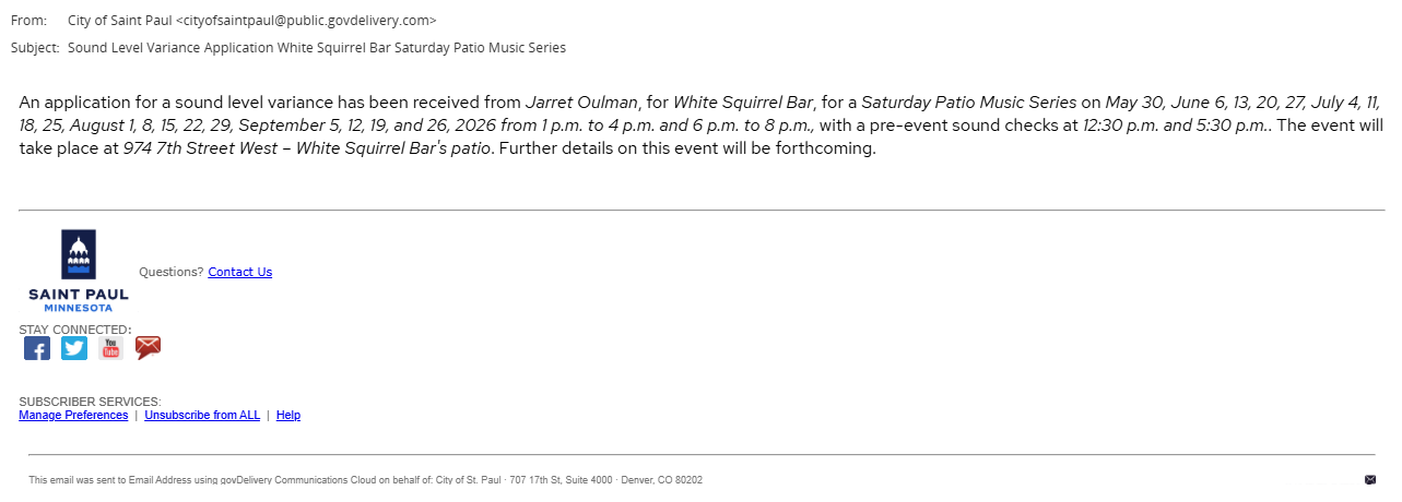 Approving the applications of White Squirrel Bar for two sound level variances in order to present amplified sound for a Saturday Patio Music Series and a Sunday Patio Music Series, every Saturday and Sunday, May 30 - September 27, 2026, at 974 7th St W - the White Squirrel Bar patio.